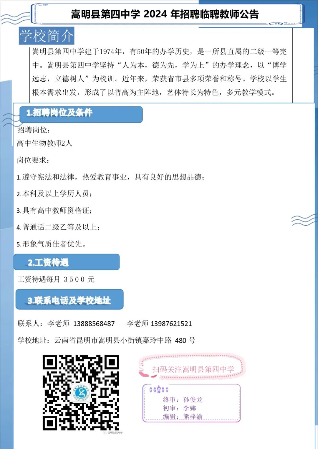 嵩明縣第四中學(xué)2024年招聘臨聘教師公告