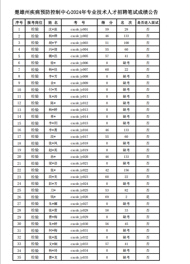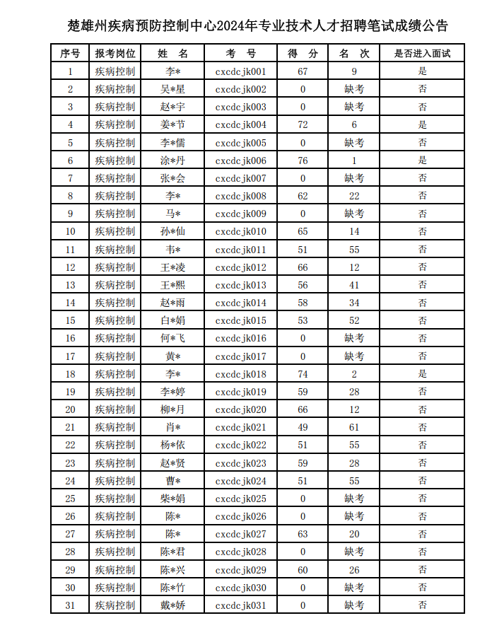 楚雄州疾病預(yù)防控制中心2024年專業(yè)技術(shù)人才招聘筆試考試已結(jié)束?,F(xiàn)將成績(jī)公告如下: