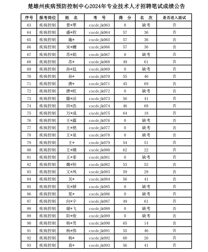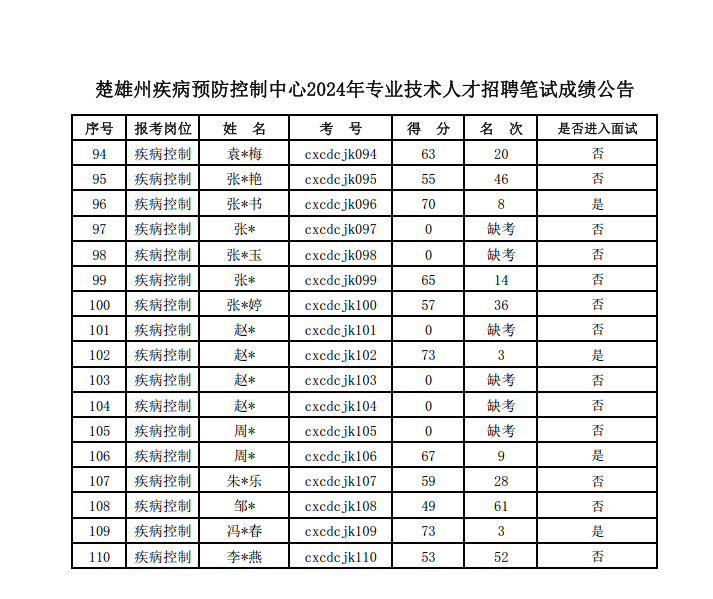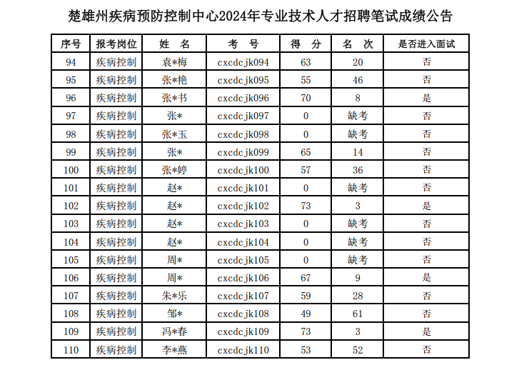 2024年楚雄州疾病預(yù)防控制中心專業(yè)技術(shù)人才招聘筆試成績(jī)公告