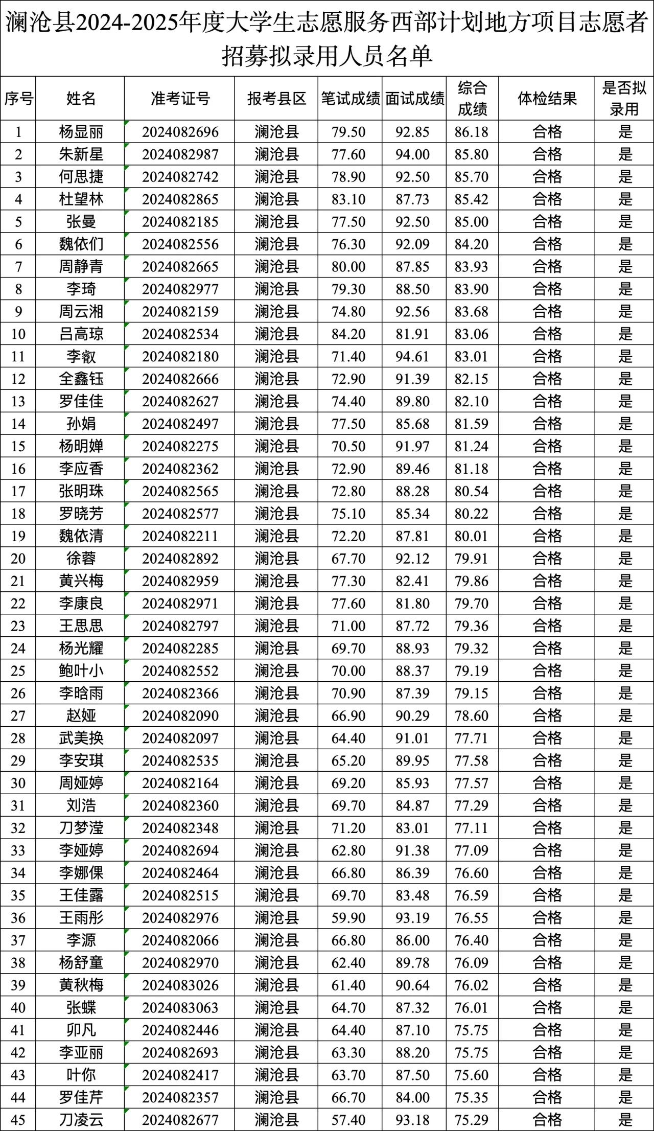 按照共青團(tuán)普洱市委《關(guān)于做好2024-2025年度大學(xué)生志愿服務(wù)西部計劃省級地方項目志愿者招募工作的通知》要求,經(jīng)過網(wǎng)上報名、資格審核、筆試、資格復(fù)審、面試、體檢等環(huán)節(jié),現(xiàn)將瀾滄縣2024-2025年度大學(xué)生志愿服務(wù)西部計劃省級地方項目志愿者擬錄用人員名單進(jìn)行公示。