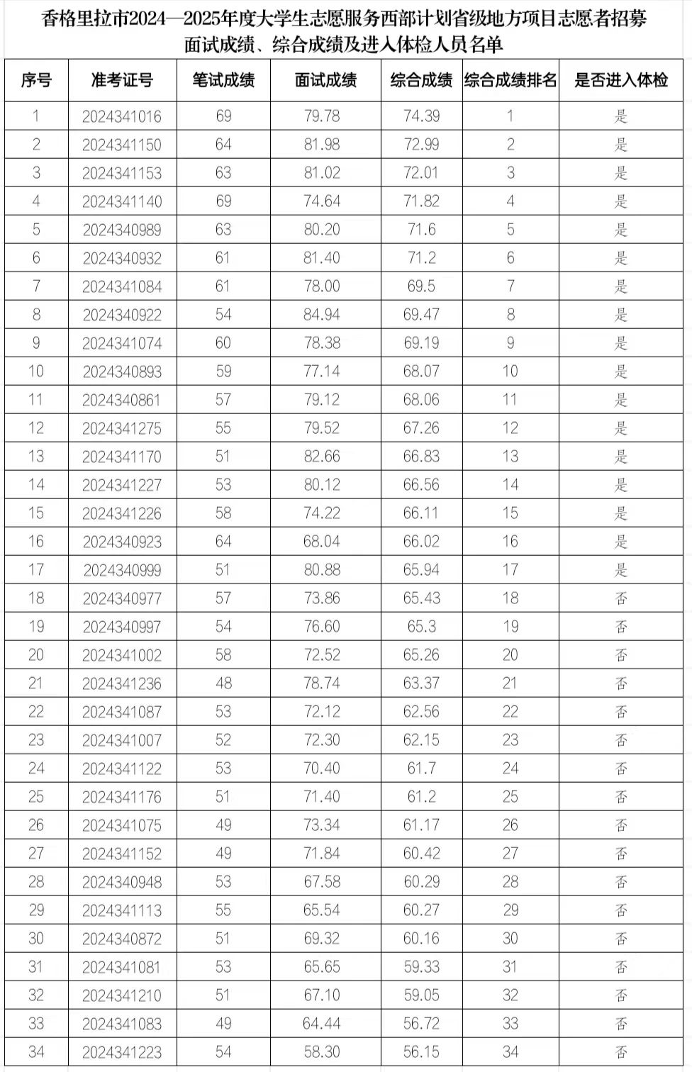 香格里拉市2024—2025年度大學生志愿服務西部計劃省級地方項目志愿者招募面試工作已于7月13日結(jié)束,根據(jù)《2024-2025年度迪慶州大學生志愿服務西部計劃省級地方項目志愿者招募公告》,現(xiàn)將香格里拉市2024—2025年度大學生志愿服務西部計劃省級地方項目志愿者招募面試成績、綜合成績及進入體檢人員進行公示,公示期為7月14日—7月16日,若考生對面試成績、綜合成績存在疑問,可在公示期內(nèi)到香格里拉市項目辦(香格里拉市行政中心1-6-08)書面反映,公示期結(jié)束后提出的一律不予受理。
