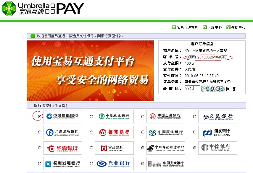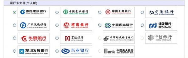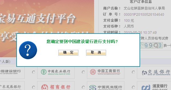 考生如果選擇用這種方式支付,需在以下所列的所有銀行中選擇一個將要使用的銀行支付方式。例如:選擇“中國建設銀行”。如圖所示: