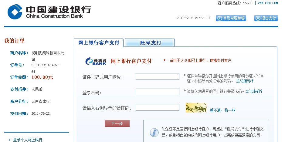 5、確定了所要到的銀行進行支付后,進入到該銀行的網(wǎng)上支付頁面,如圖所示: