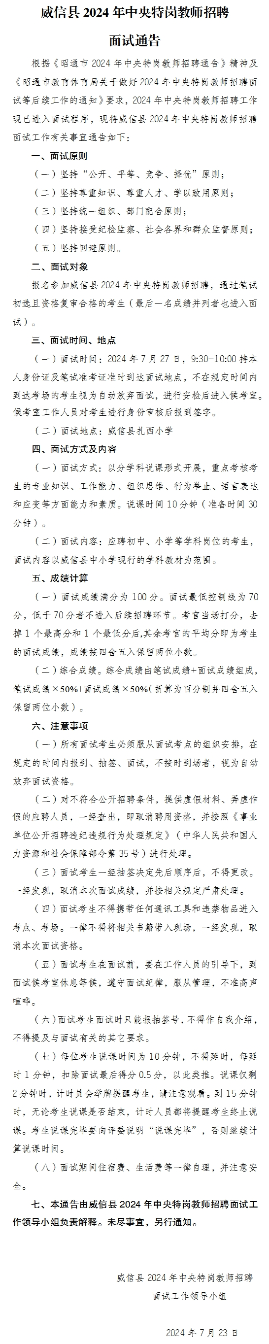 威信縣2024年中央特崗教師招聘面試通告