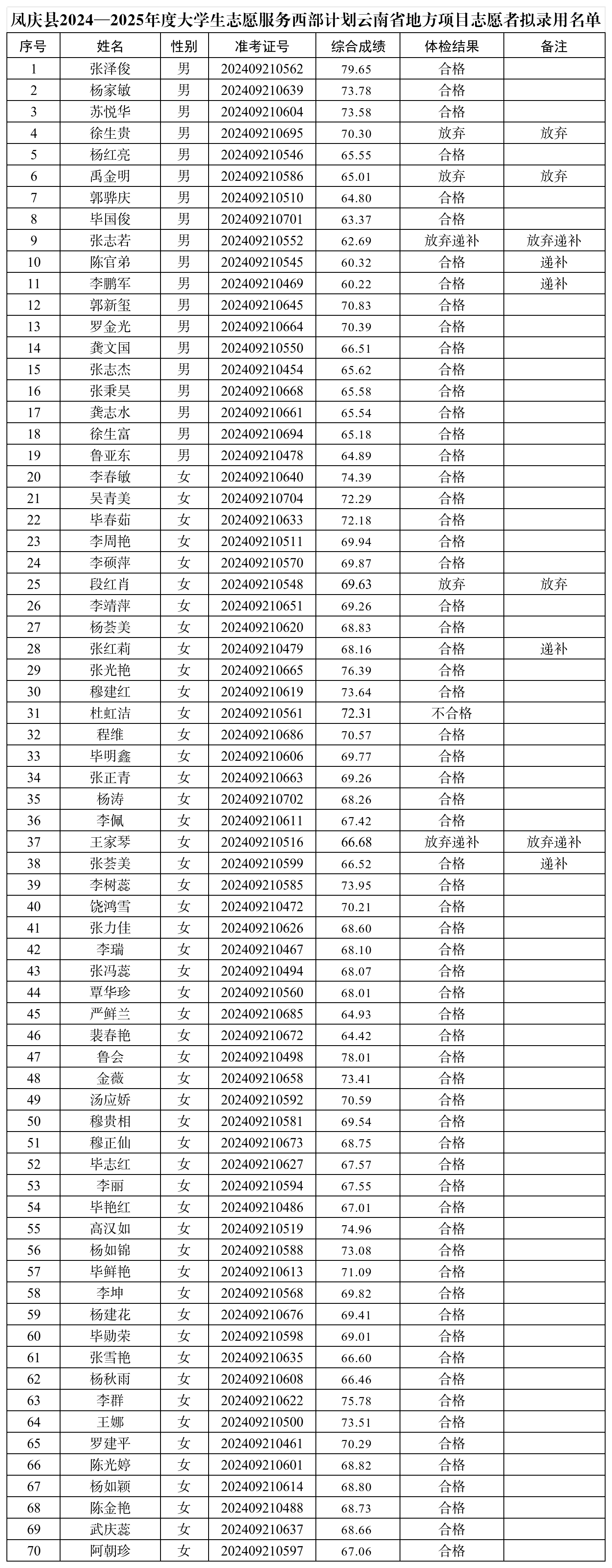 根據(jù)臨滄市項(xiàng)目辦《關(guān)于做好2024-2025年度云南省大學(xué)生志愿服務(wù)西部計(jì)劃地方項(xiàng)目志愿者招募派遣工作的通知》(云志項(xiàng)辦通〔2024〕2號(hào)文件)及有關(guān)要求,經(jīng)過(guò)筆試、資格復(fù)審、面試、體檢等程序,擬錄用張澤俊等64名應(yīng)屆畢業(yè)生為鳳慶縣大學(xué)生志愿服務(wù)西部計(jì)劃云南省地方項(xiàng)目志愿者,現(xiàn)予以公示: