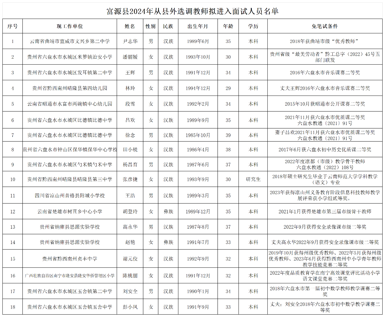 附件:富源縣2024年從縣外選調(diào)教師擬進(jìn)入面試人員名單