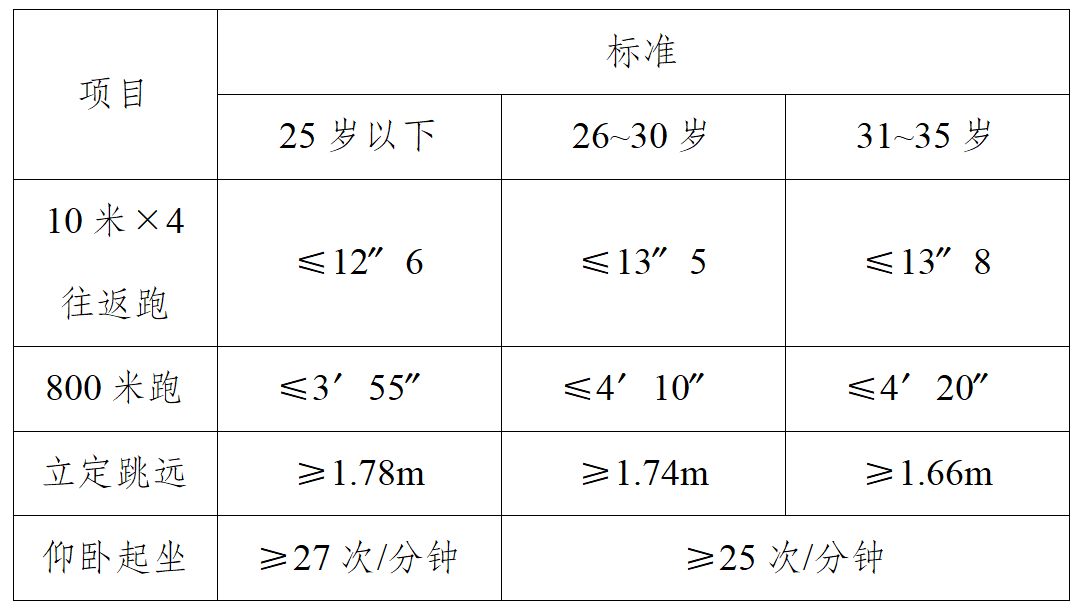 體能測試由10米×4往返跑、800米跑、立定跳遠(yuǎn)、仰臥起坐四個項目組成,占綜合成績的70%。其標(biāo)準(zhǔn)按照人民法院司法警察基本體能評分標(biāo)準(zhǔn)執(zhí)行。體能測試標(biāo)準(zhǔn)為: