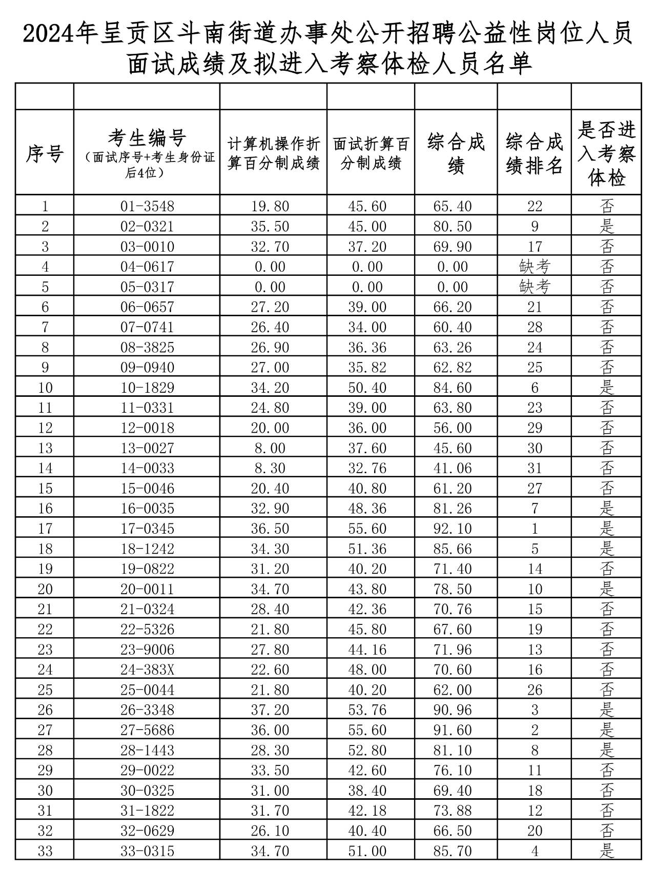 附件:2024年呈貢區(qū)斗南街道辦事處公開招聘公益性崗位人員面試成績及擬進入考察體檢人員名單.xlsx