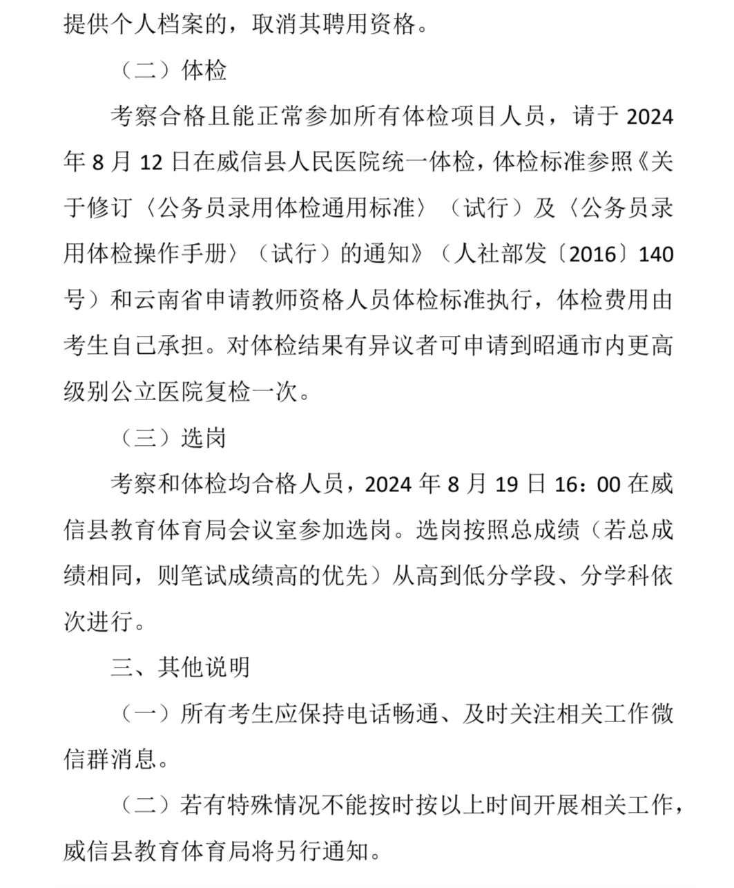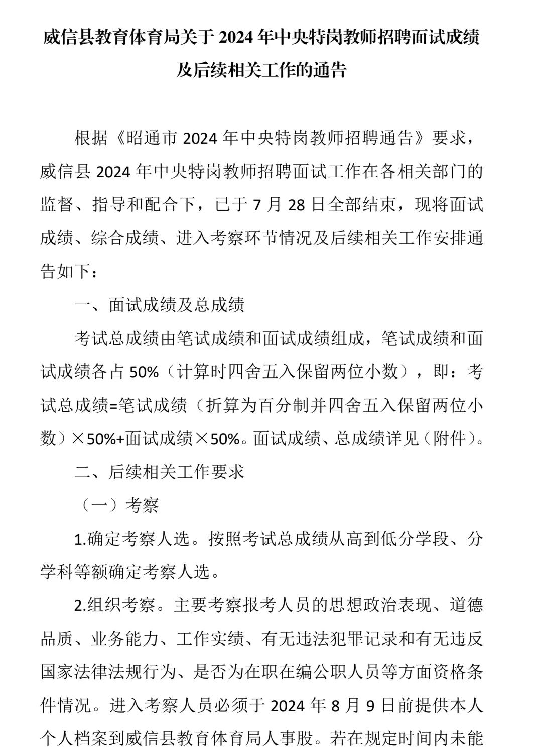 威信縣教育體育局 關(guān)于2024年中央特崗教師招聘面試成績(jī)及后續(xù)相關(guān)工作的通告