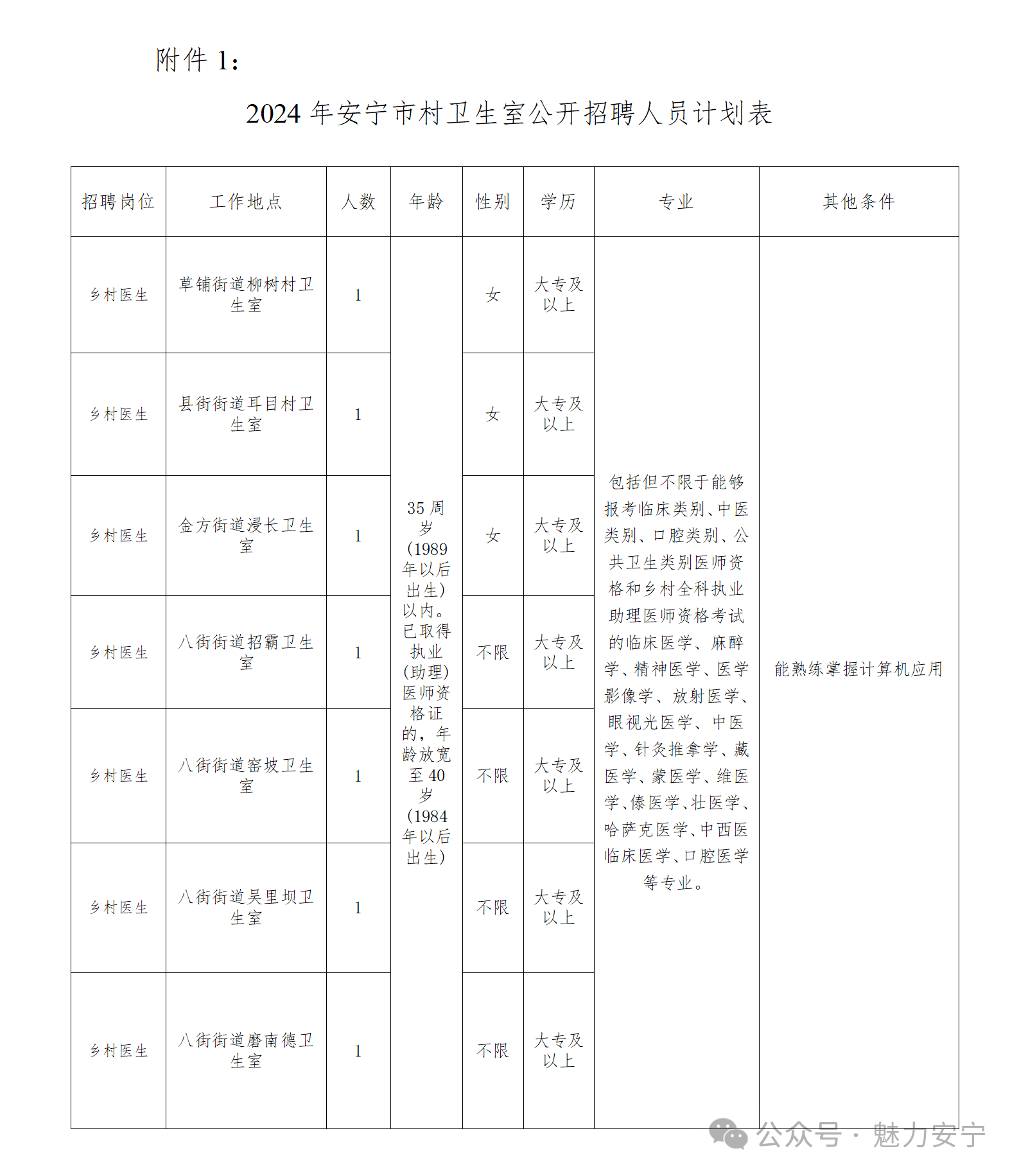 1.招聘崗位、數(shù)量及具體崗位條件詳見《2024年安寧市村衛(wèi)生室公開招聘人員計劃表》。