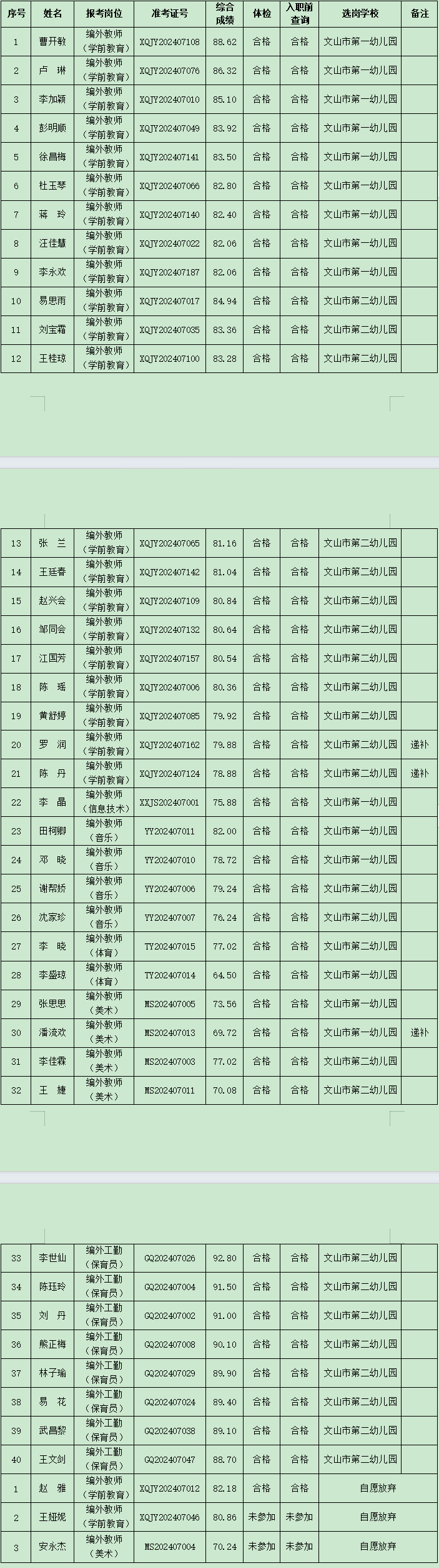 根據(jù)《2024年文山市教育體育系統(tǒng)公開(kāi)招聘幼兒園編外教職工通告》相關(guān)規(guī)定,經(jīng)報(bào)名、資格審查、筆試、面試、體檢、入職前查詢(xún)、組織選崗等程序,現(xiàn)將文山市教育體育系統(tǒng)公開(kāi)招聘幼兒園編外教職工40名擬聘用人員予以公示。