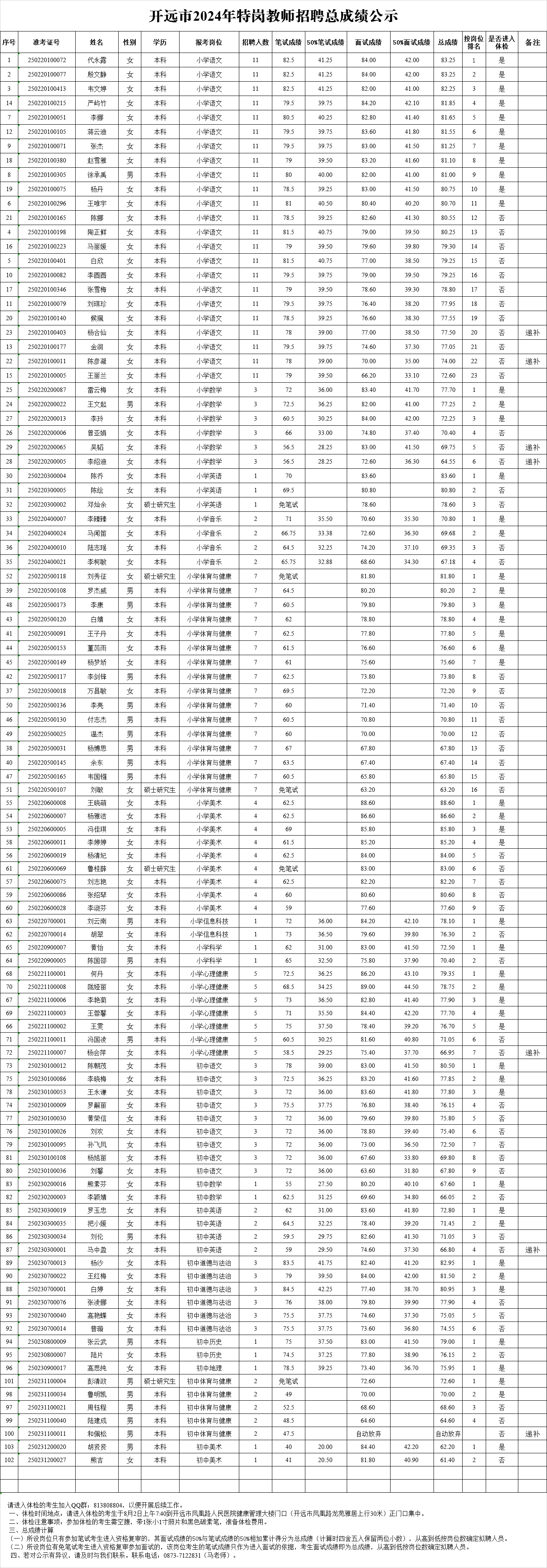 開遠(yuǎn)市2024年特崗教師招聘總成績公示