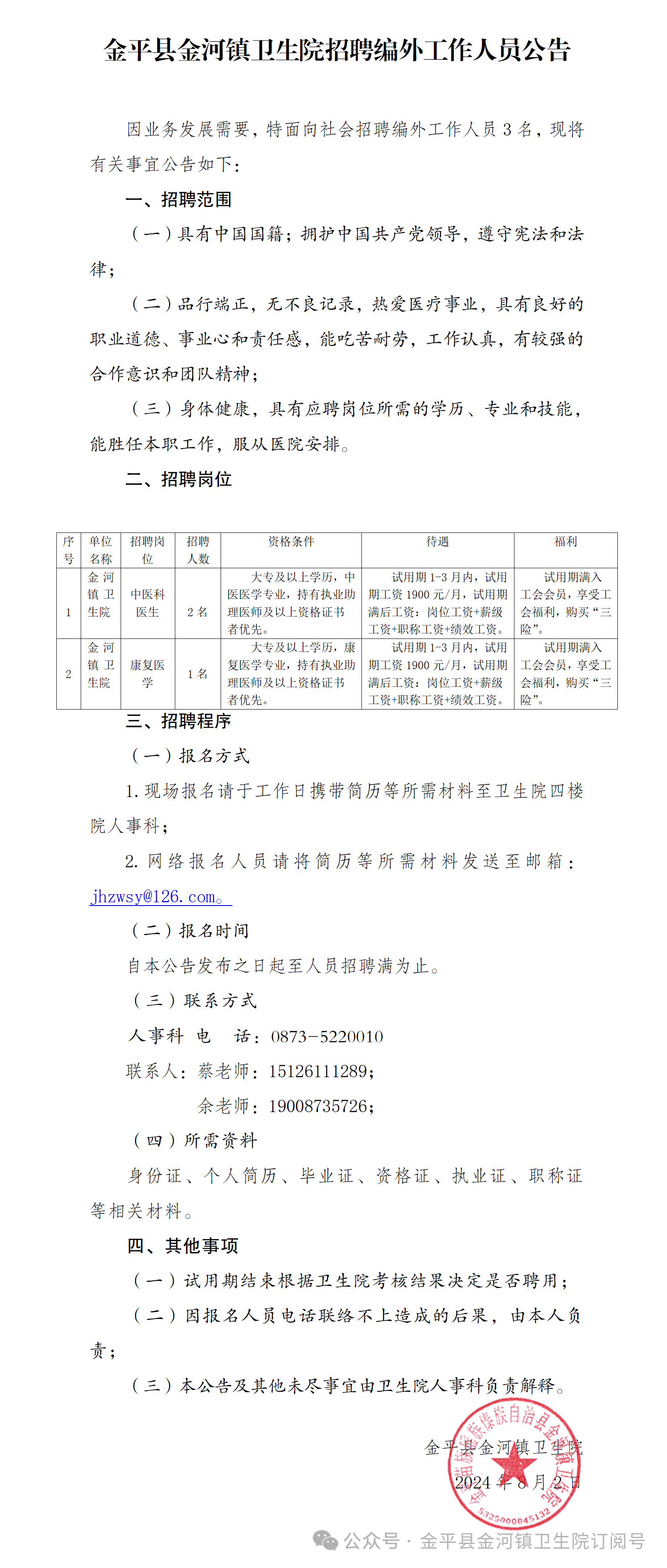 金平縣金河鎮(zhèn)衛(wèi)生院招聘編外工作人員公告