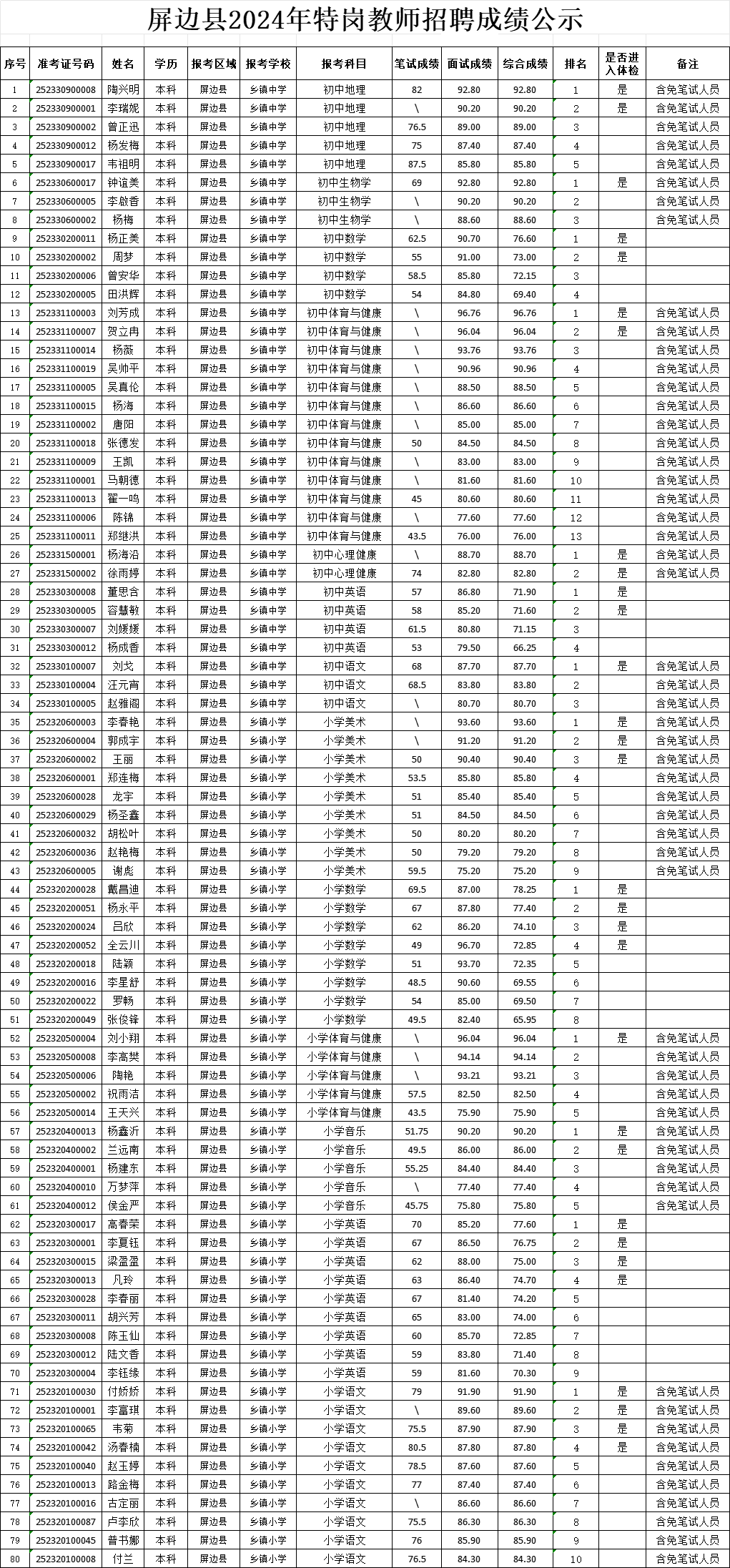 根據(jù)《紅河州2024年中央特崗教師招聘資格復(fù)審及面試公告》及《屏邊縣2024年中央特崗教師招聘資格復(fù)審及面試公告》要求,屏邊縣2024年特崗教師招聘面試工作于2024年8月1日按照面試程序和要求已全部結(jié)束,現(xiàn)將屏邊縣2024年特崗教師招聘成績公示如下: