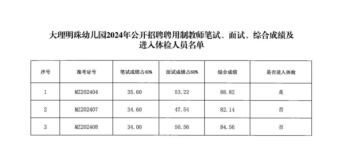 附件:大理明珠幼兒園2024年公開招聘聘用制教師筆試、面試、綜合成績及進入體檢人員名單