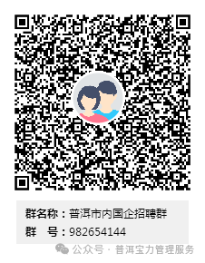 (四)招聘工作期間,報考人員應(yīng)及時關(guān)注招聘工作信息(微信公眾號“普洱寶力管理服務(wù)”,二維碼附后),并掃碼加入本次招聘考試QQ群(二維碼附后);保持聯(lián)系電話暢通,因通訊不暢等原因?qū)е孪嚓P(guān)后果由報考人員本人承擔(dān)。