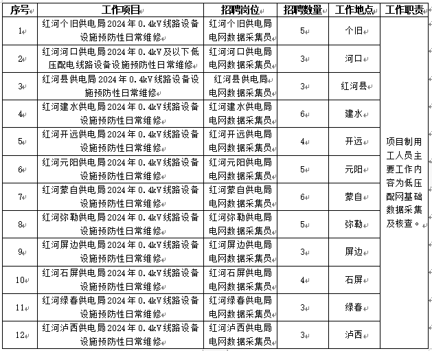 紅河供電局所屬縣級供電企業(yè)2024年項目制用工招聘公告