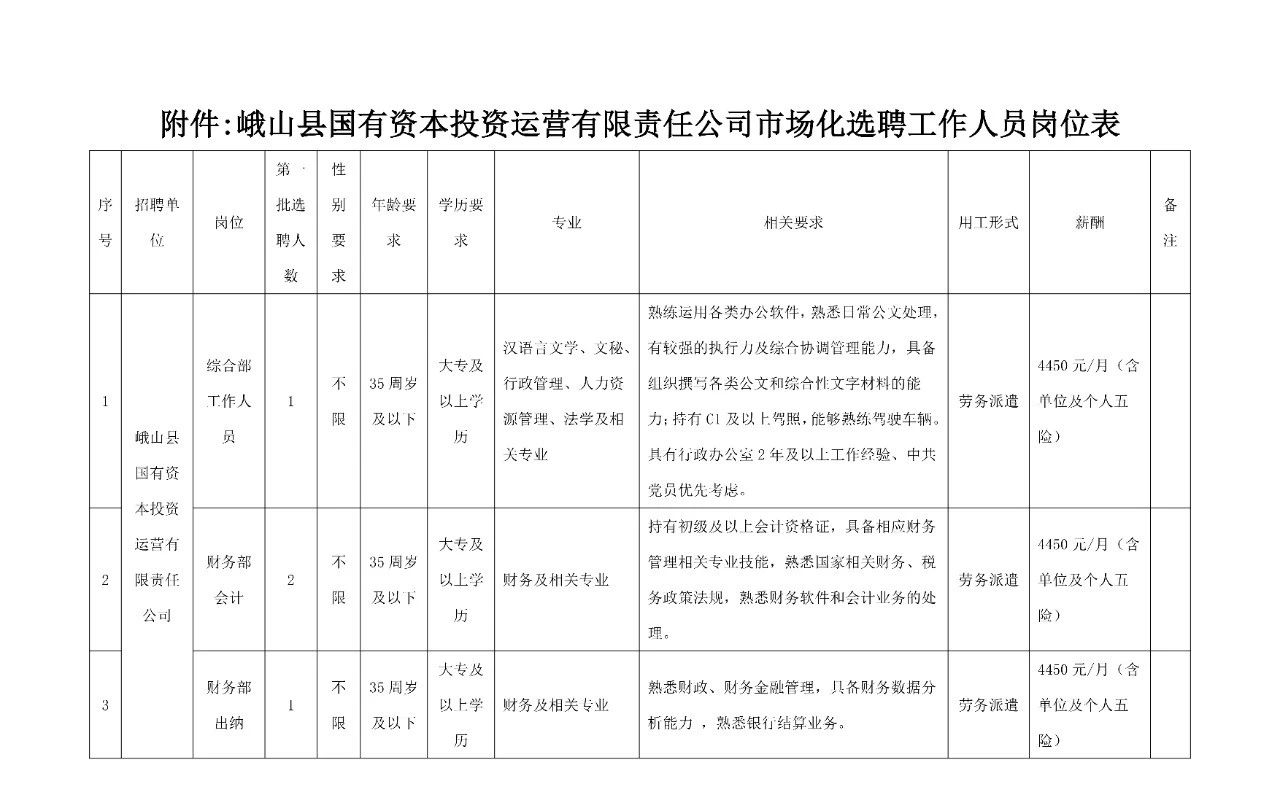 根據(jù)工作需要,現(xiàn)對(duì)《峨山縣國(guó)有資本投資運(yùn)營(yíng)有限責(zé)任公司市場(chǎng)化選聘工作人員公告》、《峨山縣國(guó)有資本投資運(yùn)營(yíng)有限責(zé)任公司市場(chǎng)化選聘工作人員延期公告》有關(guān)具體事宜補(bǔ)充公告如下: