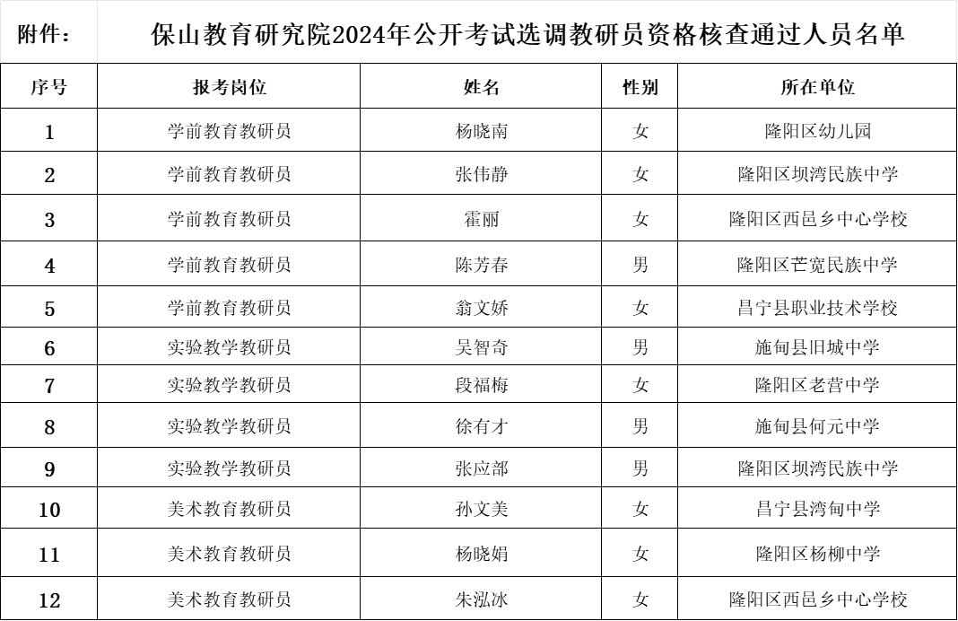 附件:保山教育研究院2024年公開考試選調(diào)教研員資格審核通過人員名單