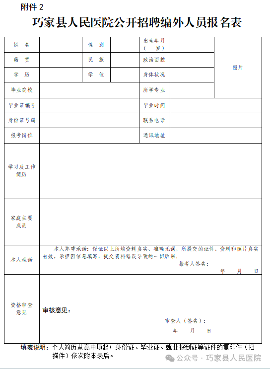 2、巧家縣人民醫(yī)院公開(kāi)招聘編外人員報(bào)名表