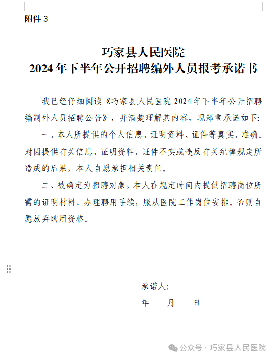 3、巧家縣人民醫(yī)院2024年下半年公開(kāi)招聘編外人員報(bào)考承諾書(shū)