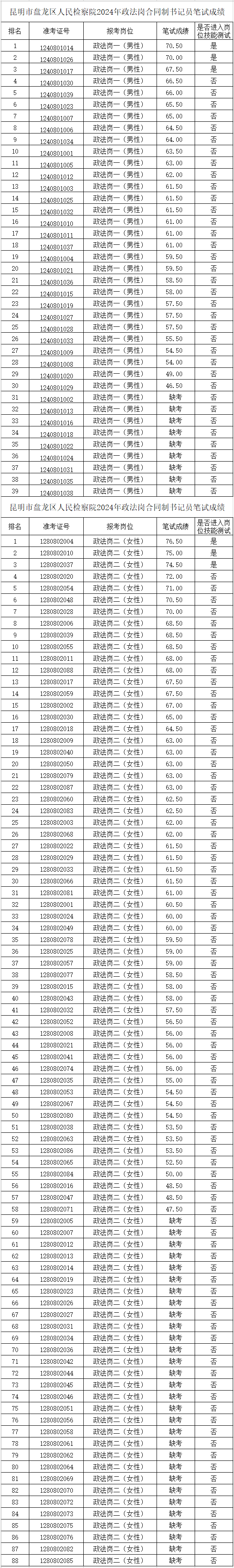 附件:昆明市盤龍區(qū)人民檢察院2024年政法崗合同制書記員筆試成績(jī)