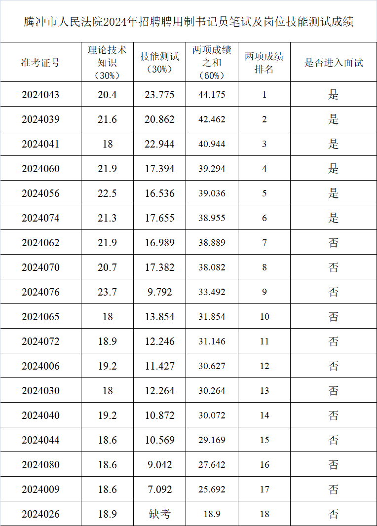 騰沖市人民法院2024年公開招聘聘用制書記員筆試及崗位技能測試工作已圓滿結(jié)束,根據(jù)《騰沖市人民法院2024年公開招聘聘用制書記員公告》的相關(guān)要求,現(xiàn)將該兩項(xiàng)成績有關(guān)事項(xiàng)公示如下: