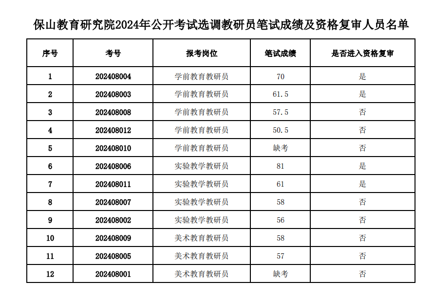 根據(jù)《保山教育研究院2024年公開考試選調(diào)教研員公告》等規(guī)定,現(xiàn)將保山教育研究院2024年公開考試選調(diào)教研員筆試成績合格分?jǐn)?shù)線及資格復(fù)審有關(guān)事項(xiàng)公告如下。