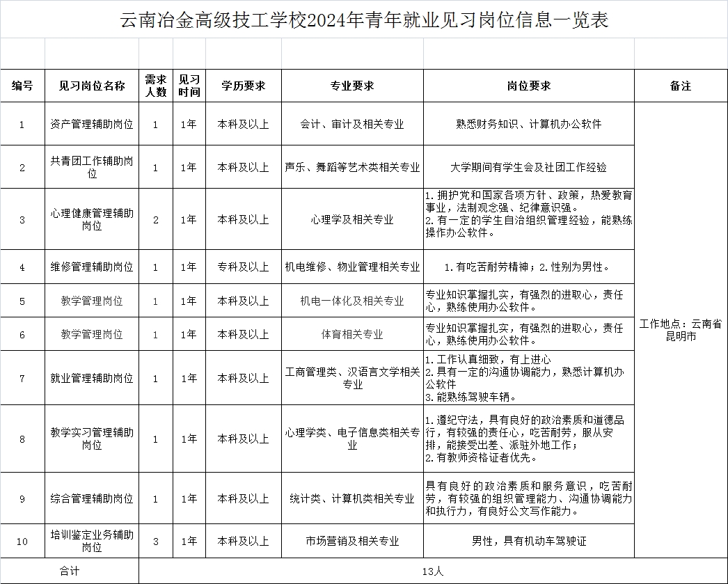 (詳見(jiàn)附件1:云南冶金高級(jí)技工學(xué)校2024年青年就業(yè)見(jiàn)習(xí)崗位信息一覽表)