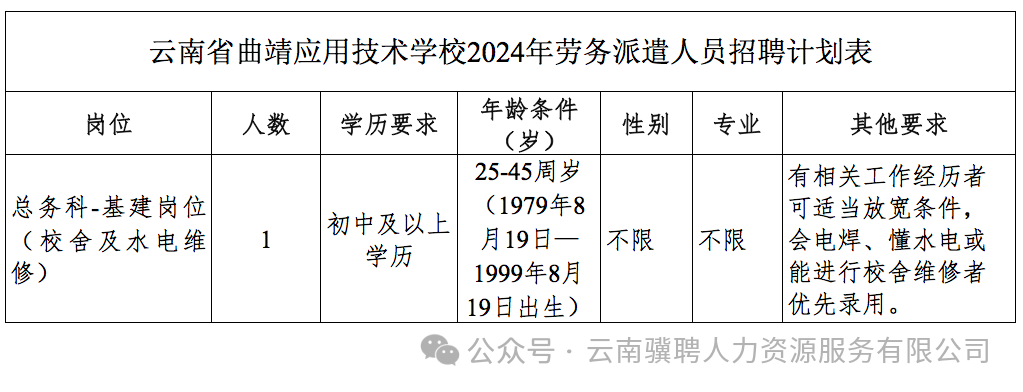 云南驥聘人力資源服務(wù)有限公司受云南省曲靖應(yīng)用技術(shù)學(xué)校委托,面向社會(huì)公開招聘勞務(wù)派遣人員1名。公司將按照勞務(wù)派遣的相關(guān)規(guī)定,結(jié)合用人單位工作實(shí)際要求,嚴(yán)格遵循“公開、平等、競(jìng)爭(zhēng)、擇優(yōu)”的原則,嚴(yán)格考核、擇優(yōu)聘用,現(xiàn)將有關(guān)事項(xiàng)公告如下: