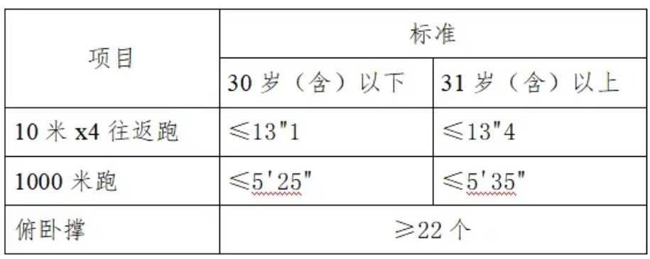 體能測(cè)試項(xiàng)目包括:1000米跑、4x10米往返跑,俯臥撐,兩項(xiàng)以上測(cè)試達(dá)標(biāo)視為體能合格。