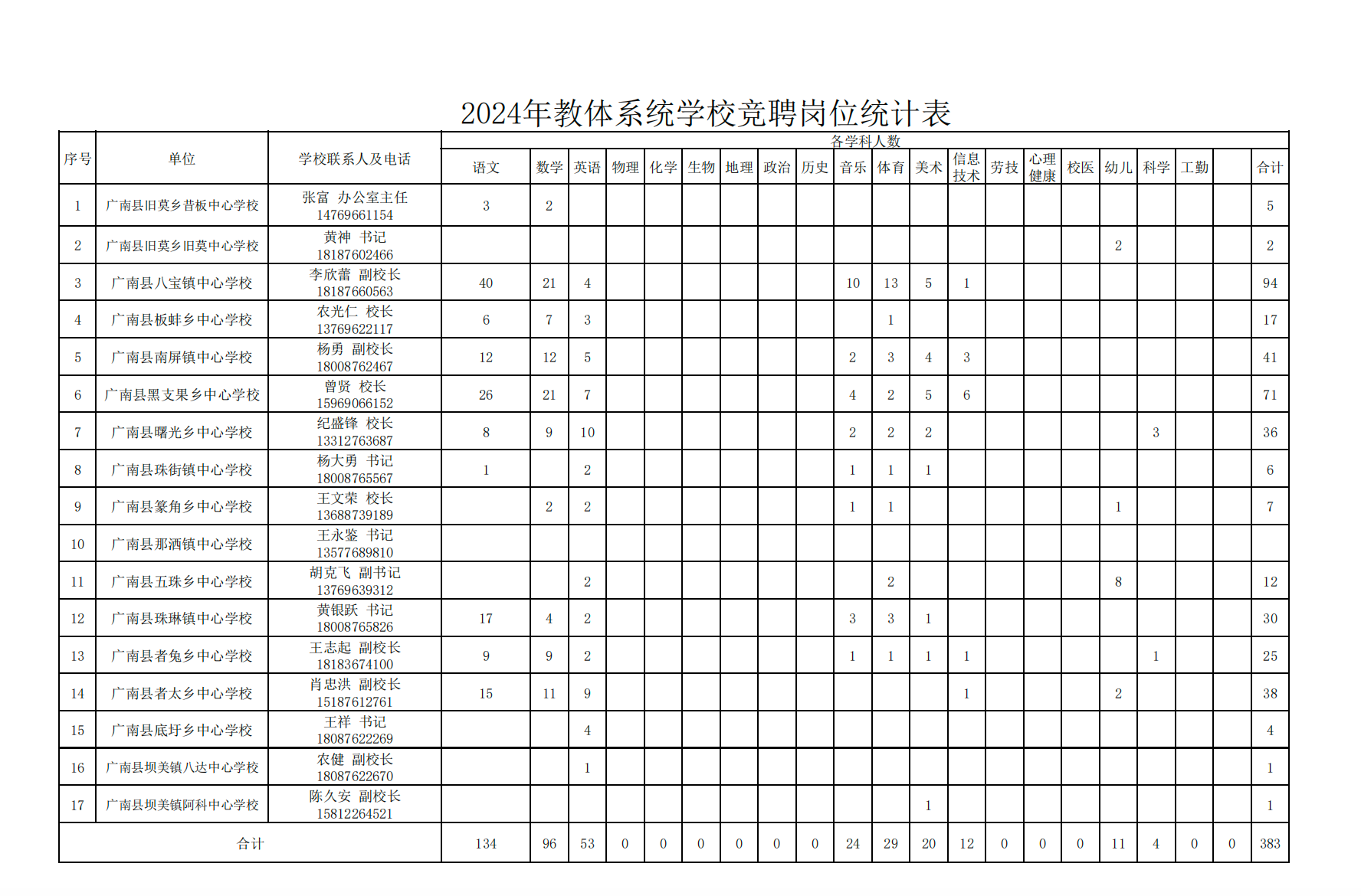 按照廣南縣“縣管校聘”的相關(guān)文件要求,為滿足學(xué)校教育教學(xué)工作需要,廣南縣各鄉(xiāng)鎮(zhèn)中心學(xué)校決定對教師空缺崗位面向全縣學(xué)校教師公開競聘,具體崗位如下: