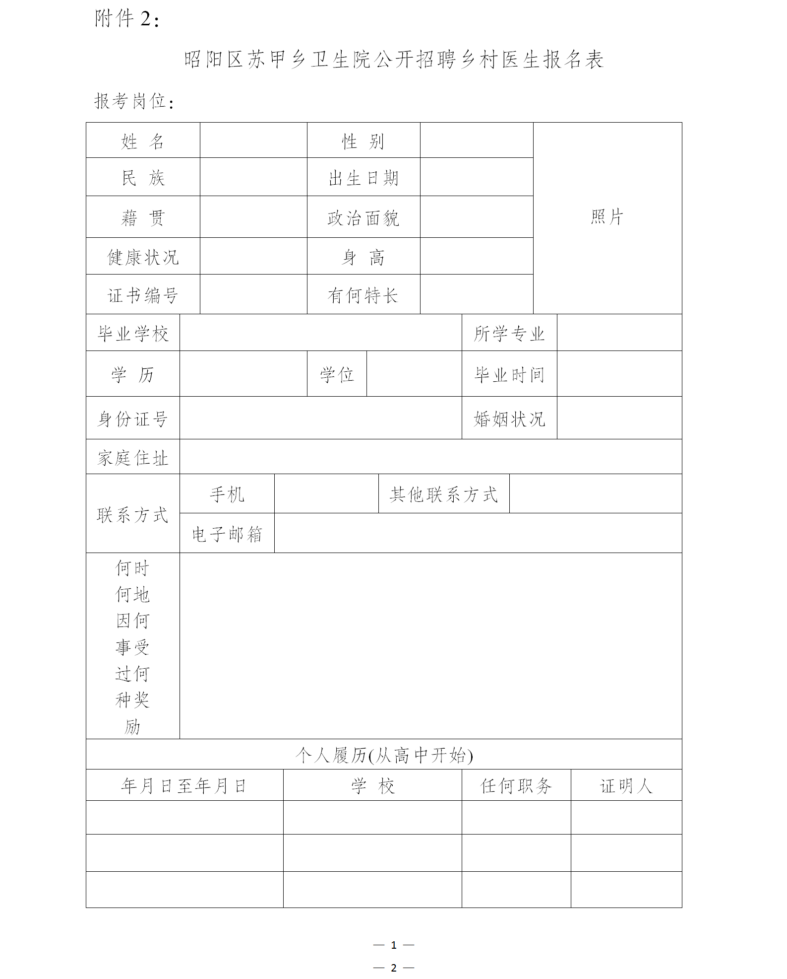 2.報(bào)名所需材料:本人身份證原件及復(fù)印件一份,畢業(yè)證、學(xué)位證、相關(guān)資質(zhì)證原件及復(fù)印件一份,近期免冠照2張、鄉(xiāng)村醫(yī)生報(bào)名表(附件2)一份。