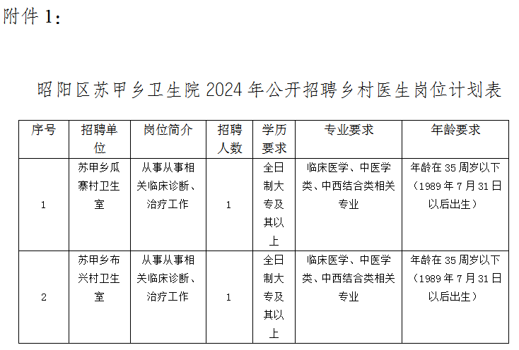 具體招聘崗位、職數(shù)詳見(jiàn)《昭陽(yáng)區(qū)蘇甲鄉(xiāng)衛(wèi)生院2024年公開招聘鄉(xiāng)村醫(yī)生崗位設(shè)置計(jì)劃表》(附件1)。