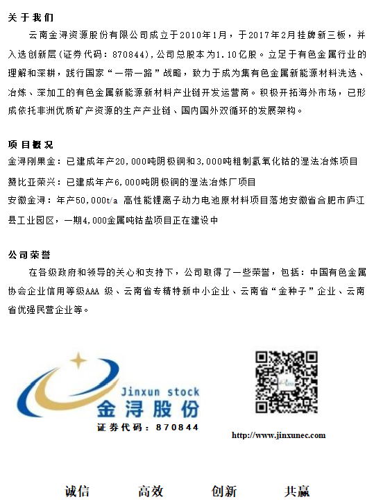 云南金潯資源股份有限公司成立于2010年1月,位于云南省昆明市高新區(qū)昌源北路1389號B幢三樓。注冊資本11029.6643萬元,是集有色金屬新能源材料選礦、冶煉、深加工及資源綜合循環(huán)利用為一體的全產(chǎn)業(yè)鏈運營商。公司于2017年2月掛牌新三板,證券簡稱:金潯股份,證券代碼:870844。公司發(fā)展始終與國家戰(zhàn)略同頻共振,積極響應(yīng)“一帶一路”倡議,踐行國家“走出去”戰(zhàn)略,順應(yīng)國家構(gòu)建國內(nèi)國際雙循環(huán)相互促進(jìn)的新發(fā)展格局號召,積極推動全球化戰(zhàn)略。