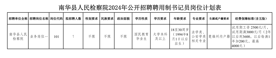 (二)崗位設置詳見附件1《南華縣人民檢察院2024年公開招聘聘用制書記員崗位計劃表》(以下簡稱《崗位計劃表》)。