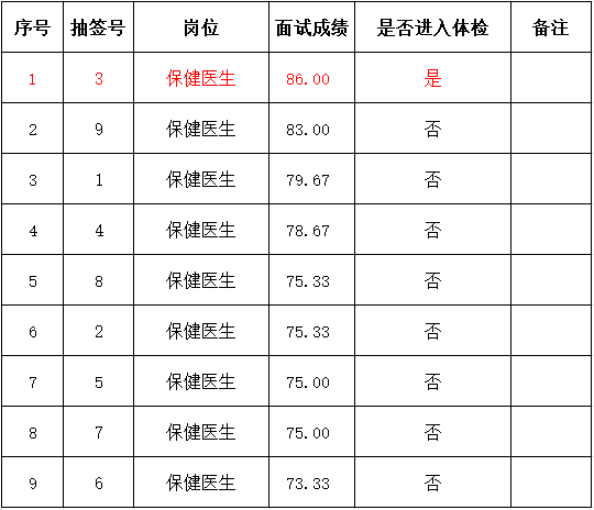 (一)保健醫(yī)生招聘1人,報(bào)考9人,實(shí)到9人,公示如下:
