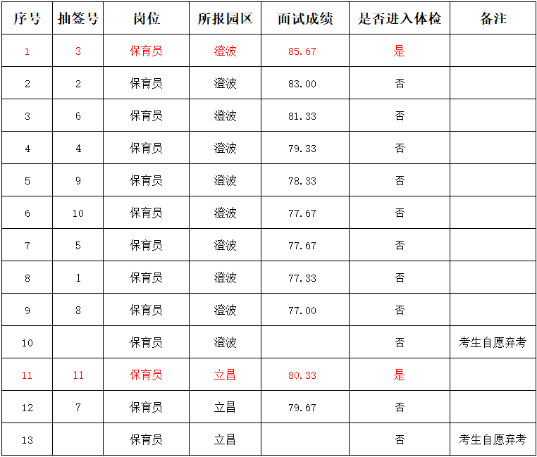 (二)保育員招聘2人,其中澄波園區(qū)1人,立昌園區(qū)1人。報(bào)考13人(澄波園區(qū)10人,立昌3人),面試過程中2名考生自愿棄考,11人參加面試,公示如下: