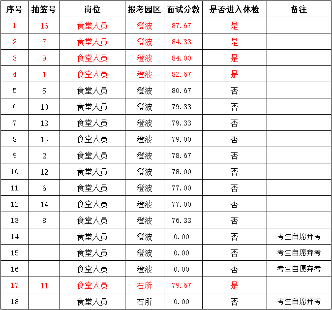(三)食堂人員招聘5人,其中澄波園區(qū)4人,右所中心幼兒園1人,報(bào)考18人(澄波園區(qū)16人,右所2人),4名考生自愿棄考,14人參加面試,公示如下: 圖片