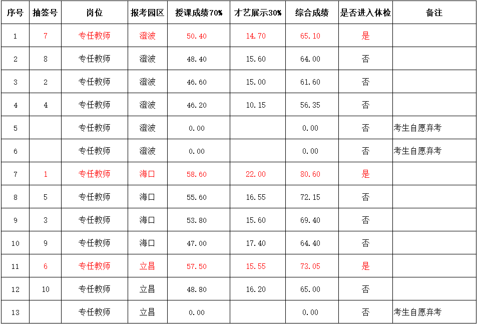 (四)專任教師招聘3人,分別是澄波園區(qū)1人,立昌園區(qū)1人,海口中心幼兒園1人,報(bào)考13人,其中3人自愿棄考,公示如下: