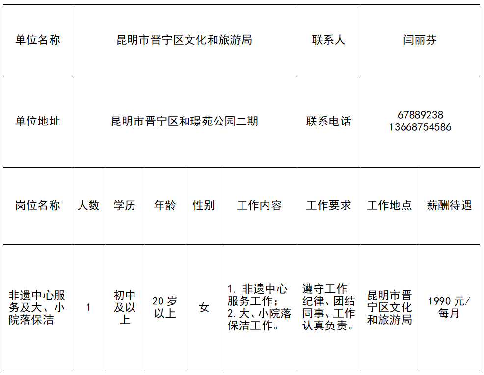 根據(jù)《昆明市人力資源和社會(huì)保障局昆明市財(cái)政局 關(guān)于做好公益性崗位開發(fā)管理有關(guān)工作的通知》(昆人社通〔2020〕37號(hào))精神,按照公開、公平、公正的原則,晉寧區(qū)文化和旅游局?jǐn)M招聘公益性崗位工作人員一名,現(xiàn)將相關(guān)情況公告如下:
