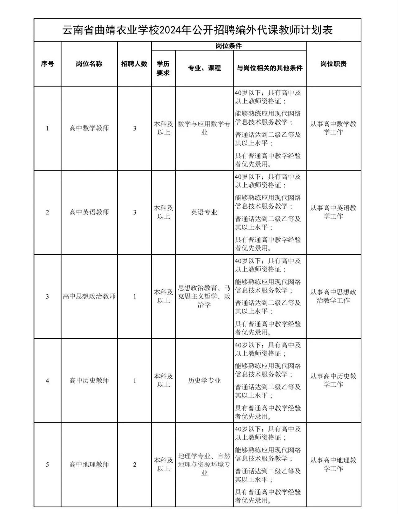 根據(jù)工作需要,云南省曲靖農(nóng)業(yè)學(xué)校計劃面向社會公開招聘編外代課教師22名,現(xiàn)將有關(guān)招聘事宜公告如下: