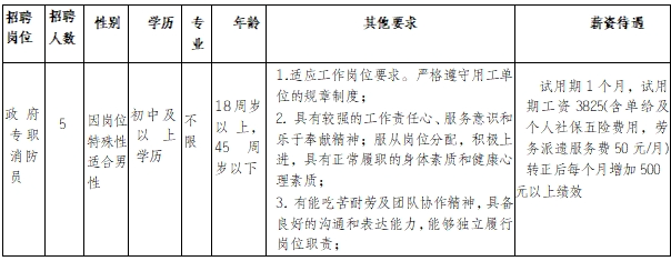 本次計(jì)劃公開(kāi)政府專職消防員5人,報(bào)考人員在符合招聘基本條件基礎(chǔ)上,需符合崗位招聘條件,具體崗位及資格范圍條件詳見(jiàn)下表: