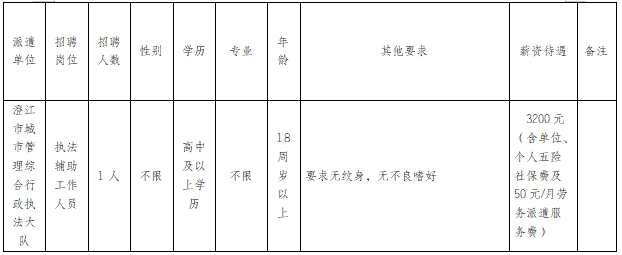 澄江市綜合行政執(zhí)法局因工作需要,委托澄江市啟澄人力資源有限責任公司,面向社會公開招聘執(zhí)法輔助工作人員1名,招聘相關(guān)事項如下: