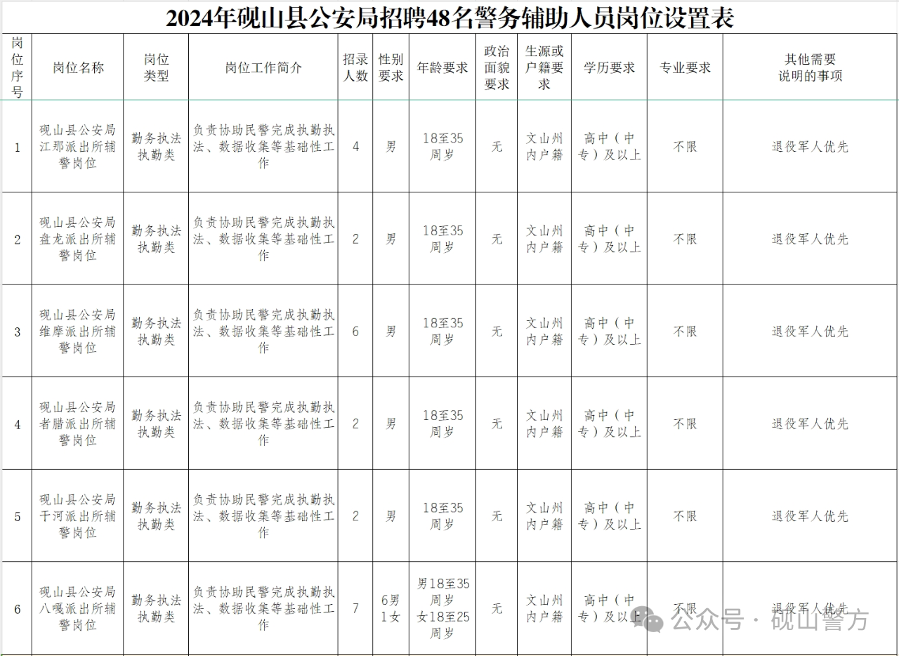 硯山縣公安局此次面向社會公開招聘輔警59名。招聘崗位及人數(shù)詳見《硯山縣公安局招聘警務(wù)輔助人員崗位設(shè)置表》。