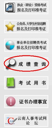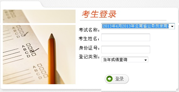 登錄報(bào)名網(wǎng)站云南人事考試網(wǎng),網(wǎng)址為:www.ynrsksw.cn、www.ynrsksw.net或www.ynrsksw.com(登錄任意一個(gè)網(wǎng)址均可查詢)。如下圖所示,在首頁(yè)的右側(cè)點(diǎn)擊“成績(jī)查詢”,選擇2013年公務(wù)員考試,在“登記類(lèi)別”欄選擇“當(dāng)年成績(jī)查詢”,輸入“考生姓名”及“身份證號(hào)”,即可查詢本人各科的詳細(xì)成績(jī)。
