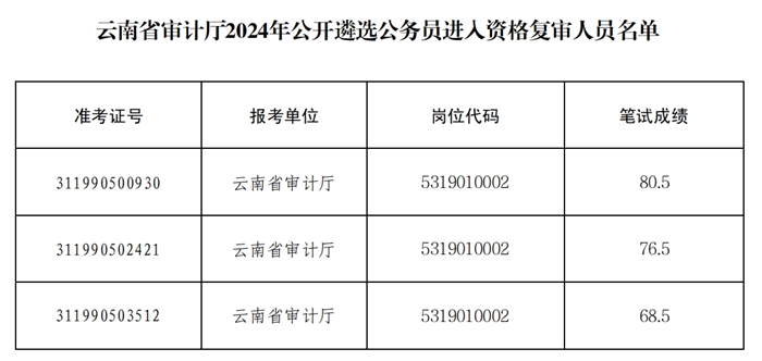 報(bào)考云南省審計(jì)廳的報(bào)考人員,按照筆試成績從高到低的順序,以與遴選職位數(shù)3:1的比例確定資格復(fù)審人員。名單詳見附件。