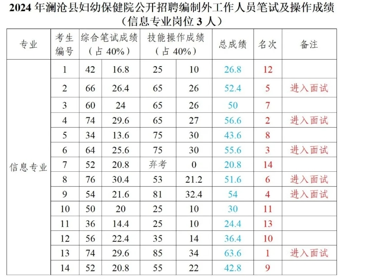 根據(jù)《瀾滄縣緊密型醫(yī)共體成員單位(婦幼保健院)2024年第三批人才招聘公告》,9月9日,瀾滄縣婦幼保健院在1號樓六樓進行了人才招聘綜合筆試、技能操作考試,現(xiàn)將2024年瀾滄縣婦幼保健院第三批公開招聘編制外工作人員成績公示如下: