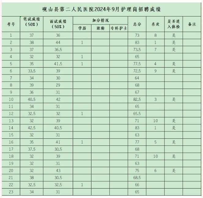 硯山縣第二人民醫(yī)院2024年9月招聘編外護(hù)理崗成績公示如下: