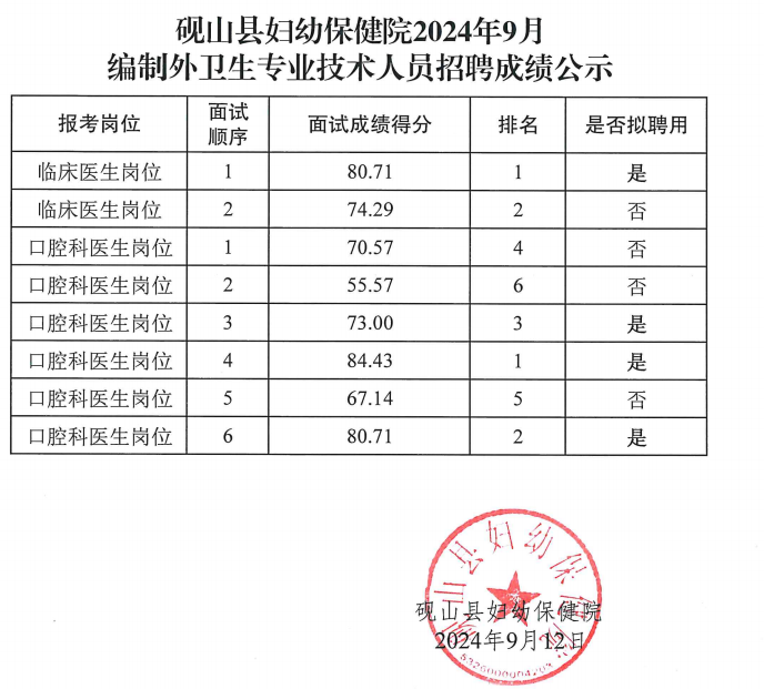 2024年9月編制外衛(wèi)生專業(yè)技術人員招聘成績公示: